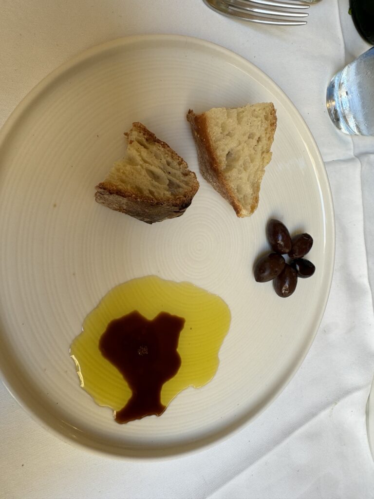 Fresh bread arrived first, served with golden olive oil and balsamic vinegar, alongside a few olives. It’s a small thing, but when the ingredients are this good, it sets the tone for the whole meal.