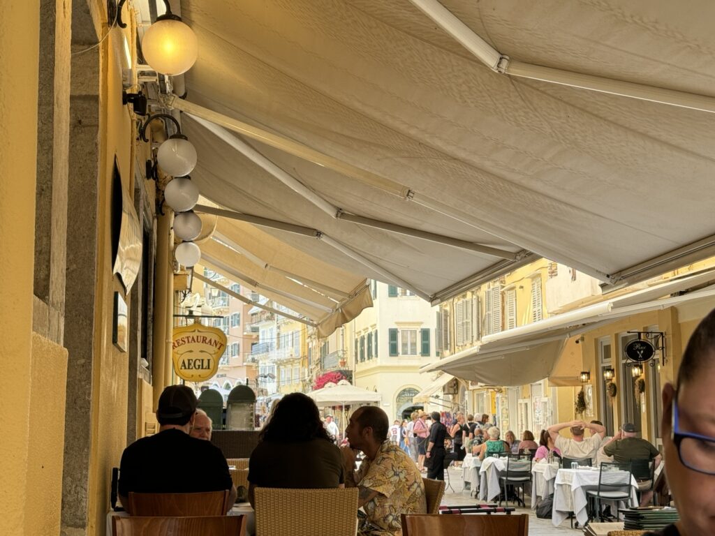 Aegli sits right along one of Corfu Town’s lively pedestrian streets, so while we ate we could watch locals and travelers wander past, browse nearby shops, and stop for coffee or wine at neighboring cafés.
