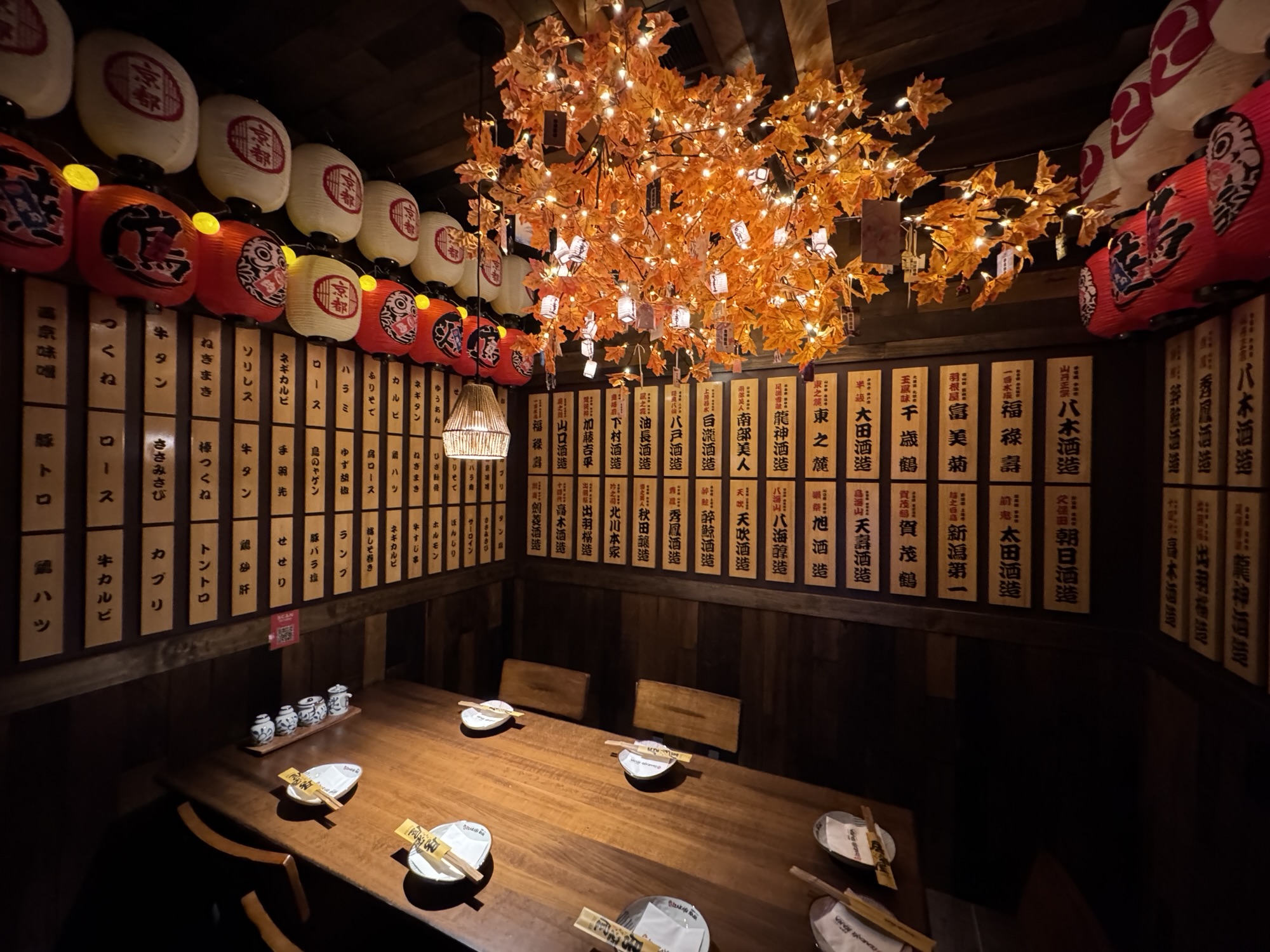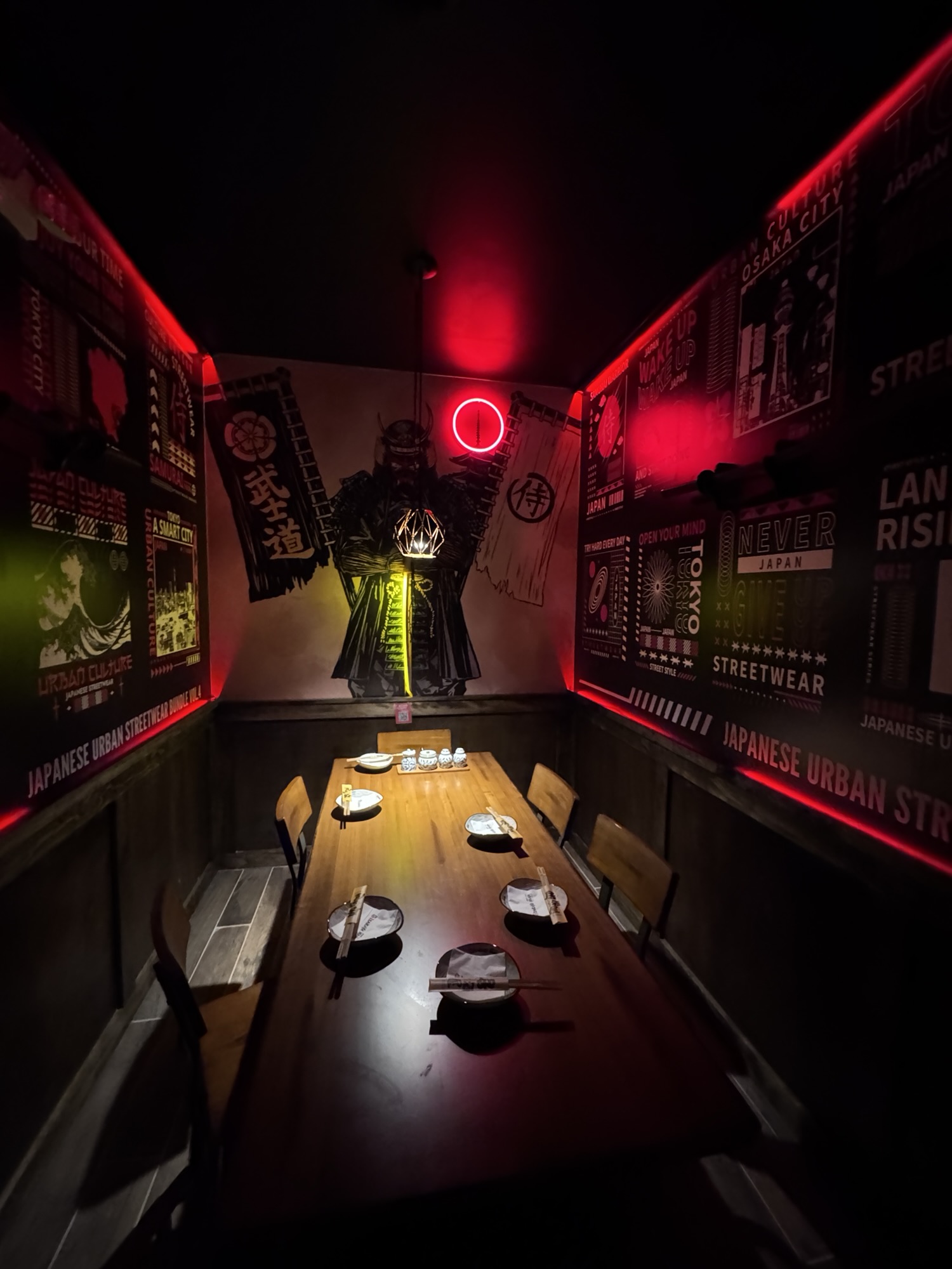 Some feel warm and traditional, with wooden walls and glowing lanterns overhead. Others lean more modern, with neon accents and bold Japanese street-culture artwork.