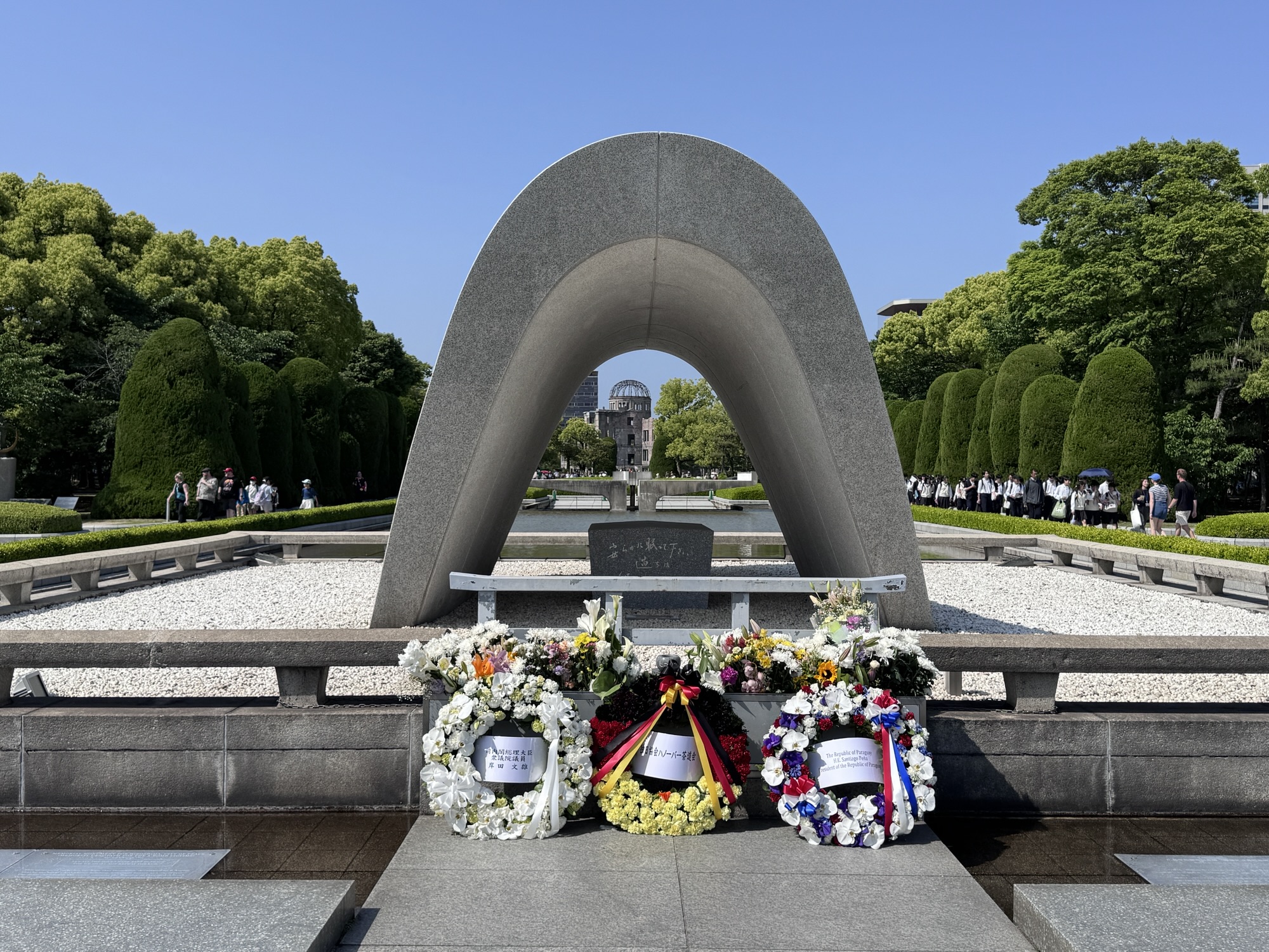 One of the most recognizable structures in the park is the Memorial Cenotaph, which frames a direct view toward the Atomic Bomb Dome in the distance.